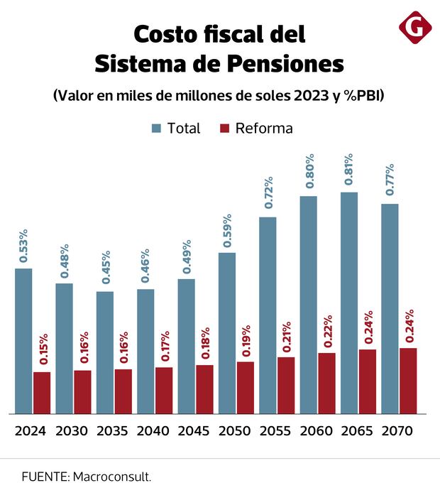 Dicho costo es inferior al proyectado por el Consejo Fiscal (1.1% del PBI) y el Ministerio de Economía y Finanzas (MEF), que va desde 2.7% del PBI en 2025 hasta 6.5% en el 2040.