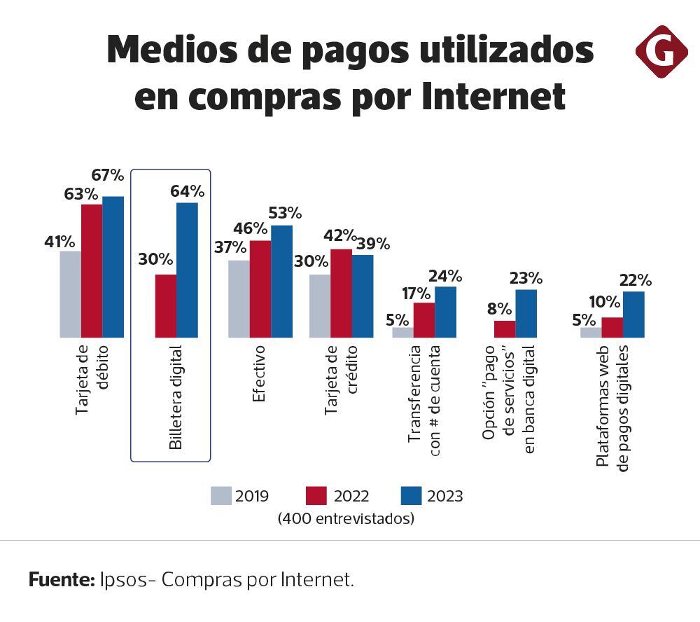 Así, las compras con la tarjeta de crédito como medio de pago bajó desde 42% (porcentaje de personas que usan los plásticos) al cierre de 2022 hasta 39% a la fecha, mientras que el manejo de tarjeta de débito subió de 63% a 67% y el uso de las billeteras digitales se duplicó de 30% a 64% en el mismo periodo, detalló.