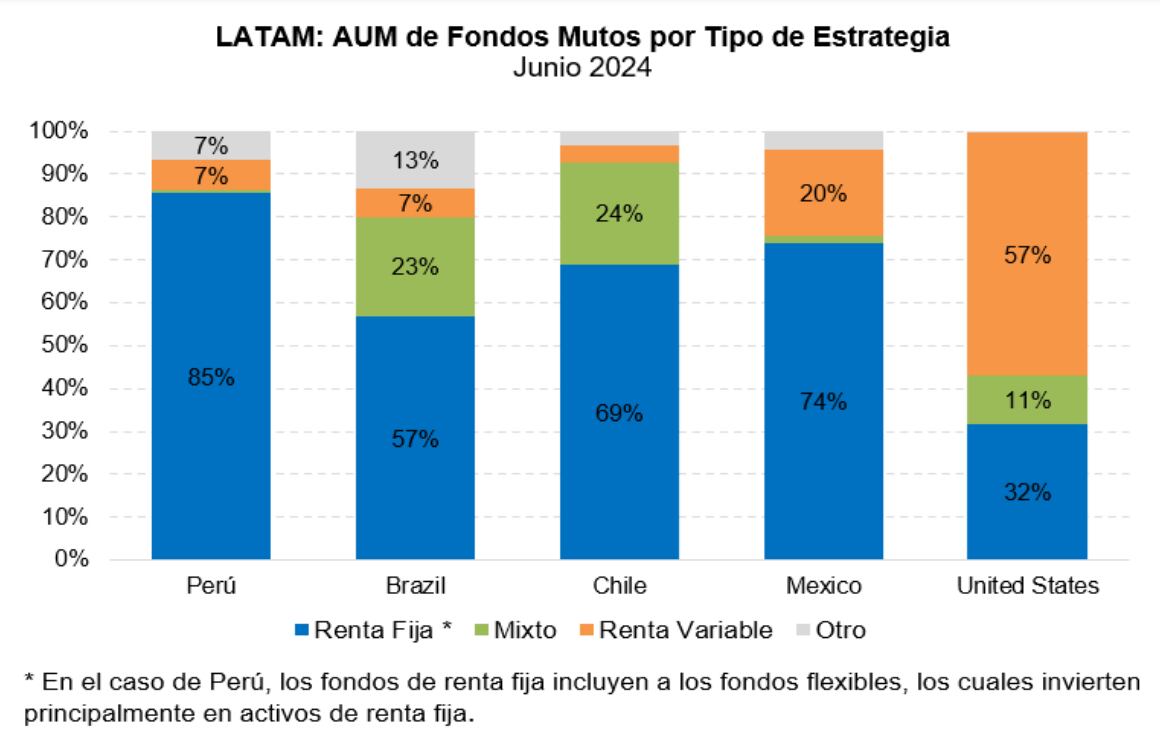 En cuanto a la composición de los fondos por tipo de estrategia, menciona que la participación predominante de fondos especializados en renta fija en Perú es similar a la de sus pares en la región.