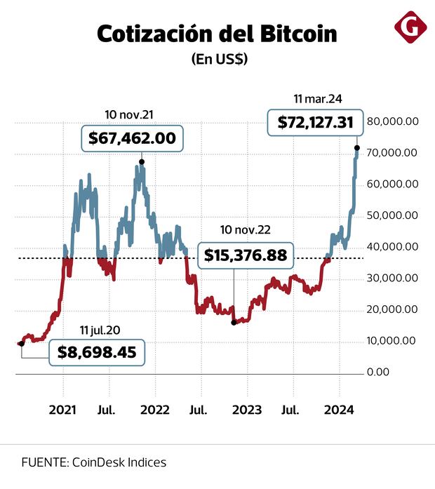 Así, la cotización del bitcoin superó ayer los US$ 72,127 alcanzando máximos históricos, lo que implica que en el último año se triplicó desde un valor de US$ 20,454.