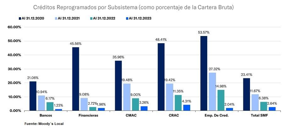 Según Moody´s Local, los créditos reprogramados del sistema financiero (que a partir del 2023 incorporaron los recalendarizados por situaciones de Emergencia) representaron 2.64% de la cartera bruta al 31 de diciembre del 2023.