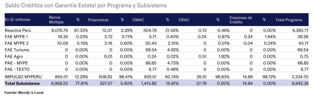 A diciembre del 2023, el sistema financiero registró un saldo de créditos con garantía estatal de S/ 8,942.4 millones, de los cuales un 26.11% correspondió al programa Impulso Myperu y un 71.50% a préstamos Reactiva Perú, según Moody´s Local.