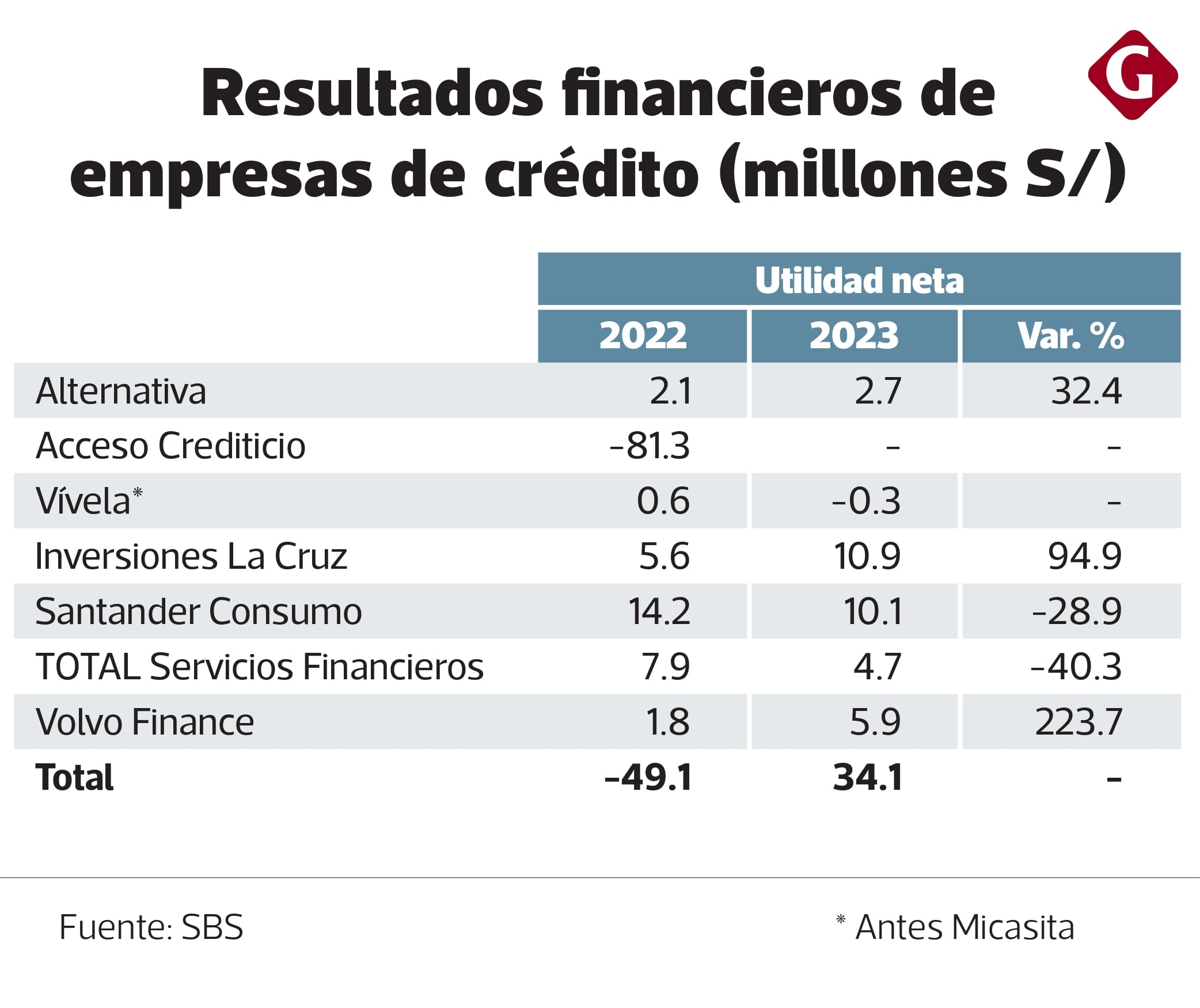 En contraste, las empresas de crédito fueron las únicas con ganancias netas en conjunto, las cuales sumaron S/ 34.1 en el periodo en análisis. En dicho año, la SBS revocó la licencia de funcionamiento a Acceso Crediticio.