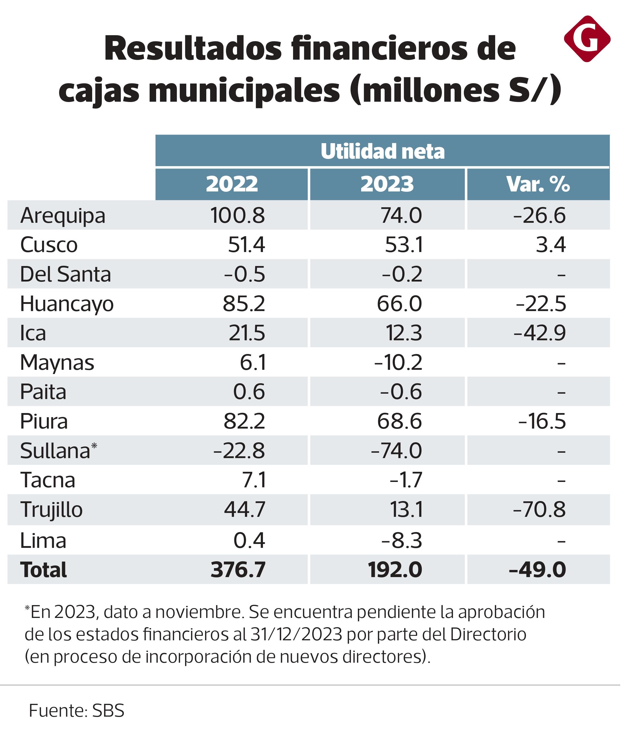 En el 2023, las cajas municipales ganaron en conjunto S/ 192 millones, casi la mitad de lo generado en el 2022 (S/ 376.7 millones), según estadísticas de la Superintendencia de Banca, Seguros y AFP (SBS).