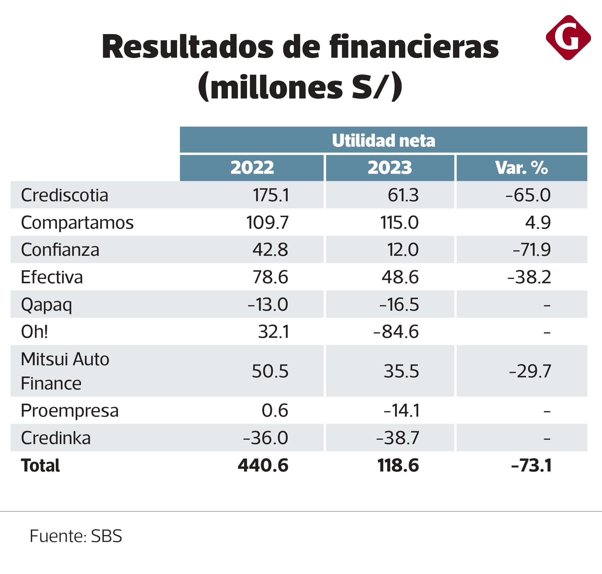 Las financieras siguieron la misma suerte y observaron una caída en sus resultados a la tercera parte, desde S/ 440.6 millones a S/ 118.6 millones, en el mismo periodo.