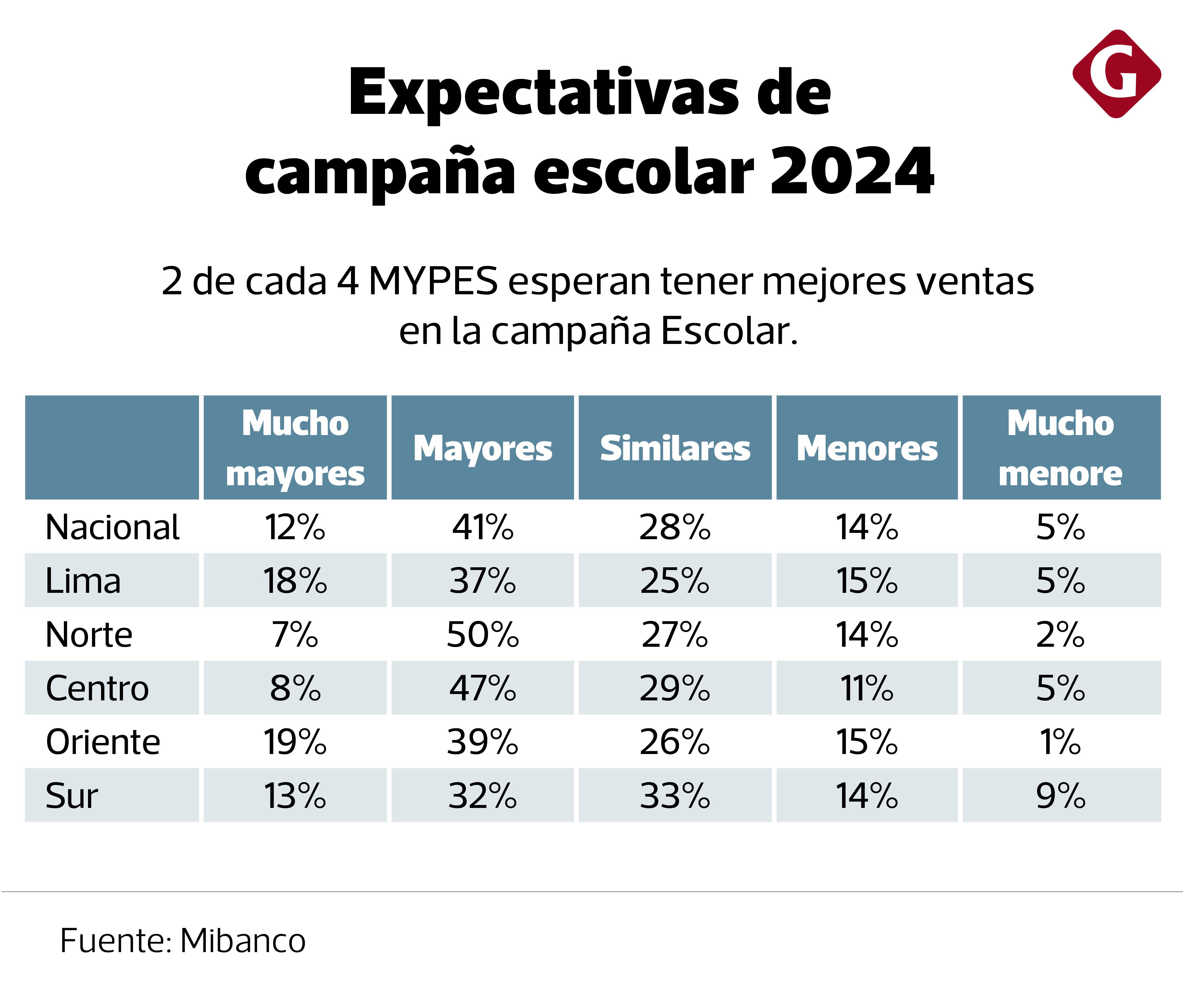 Según la encuesta de Mibanco, la mitad de las mypes espera tener ventas mayores o mucho mayores en esta campaña escolar comparadas con las del 2023. Aunque, al evaluar por regiones, se observa una perspectiva más conservadora en el sur del país, que responde al riesgo latente de rebrotes de convulsión social, explicó Espinoza.