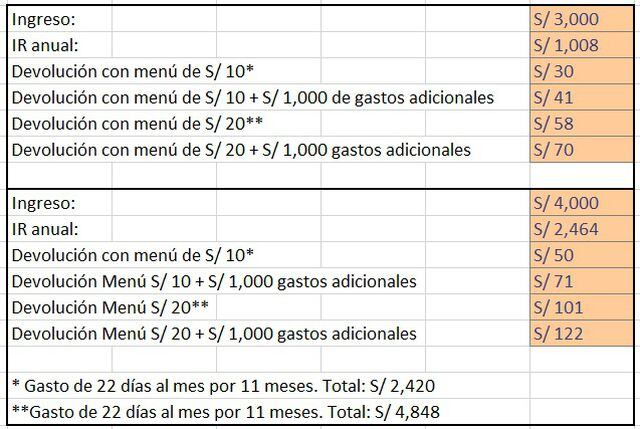 Con el gasto de un menú de S/ 10, la devolución anual sería de S/ 50. Y si se suma S/ 1,000 por gastos extras sustentados, la devolución subiría a S/ 71.