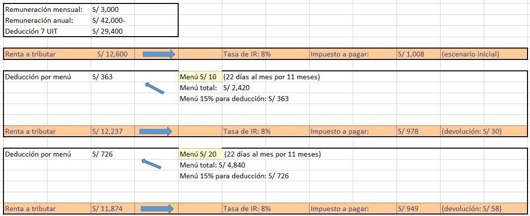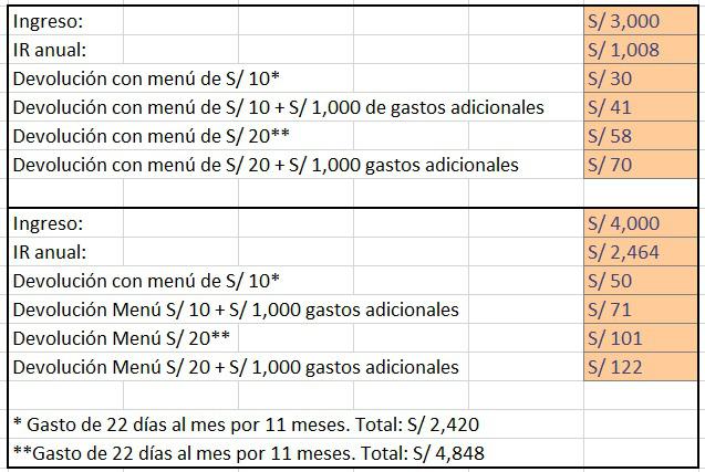 Con el gasto de un menú de S/ 10, la devolución anual sería de S/ 50. Y si se suma S/ 1,000 por gastos extras sustentados, la devolución subiría a S/ 71.
