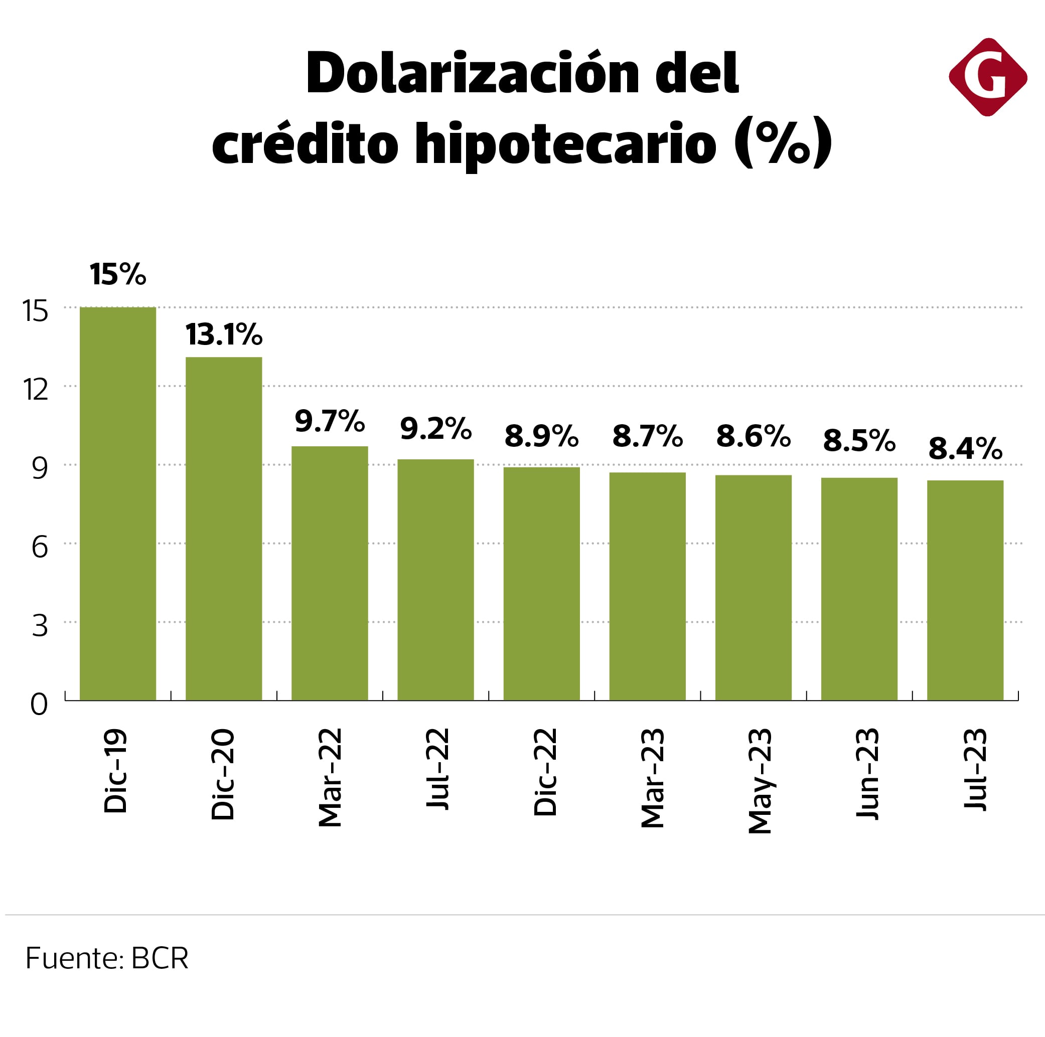 El coeficiente de dolarización de los créditos hipotecarios, es decir, el porcentaje de estos préstamos otorgados en moneda estadounidense disminuyó a 8.4% en julio, dato inferior al registrado en similar mes de 2022 (9.2%), de acuerdo con información del Banco Central de Reserva del Perú (BCR).