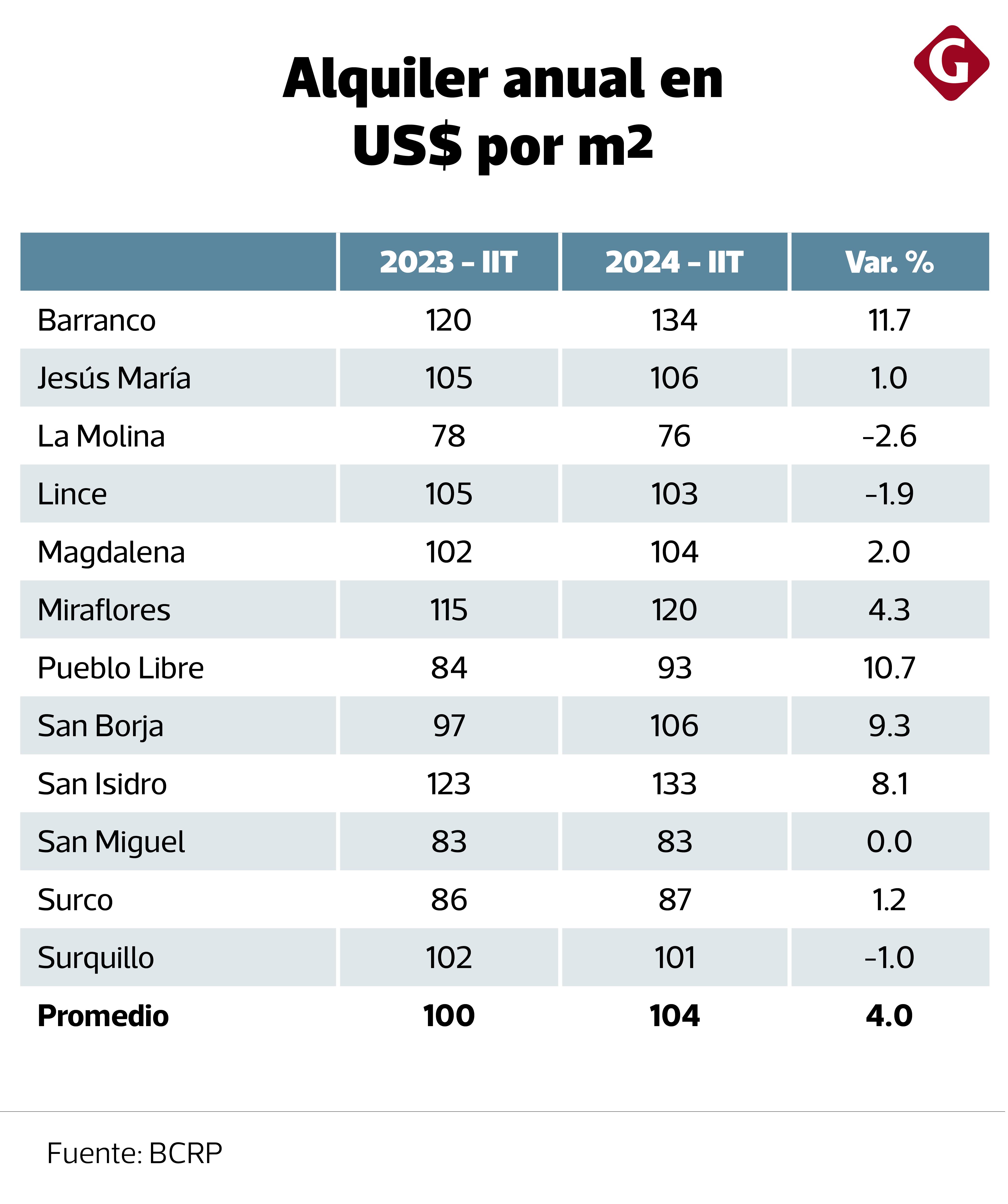 En un análisis desagregado, el alquiler anual subió más, de un año a otro, en Barranco, Pueblo Libre y San Borja. El precio de venta exhibió una mayor alza en San Isidro, Pueblo Libre y Surquillo.