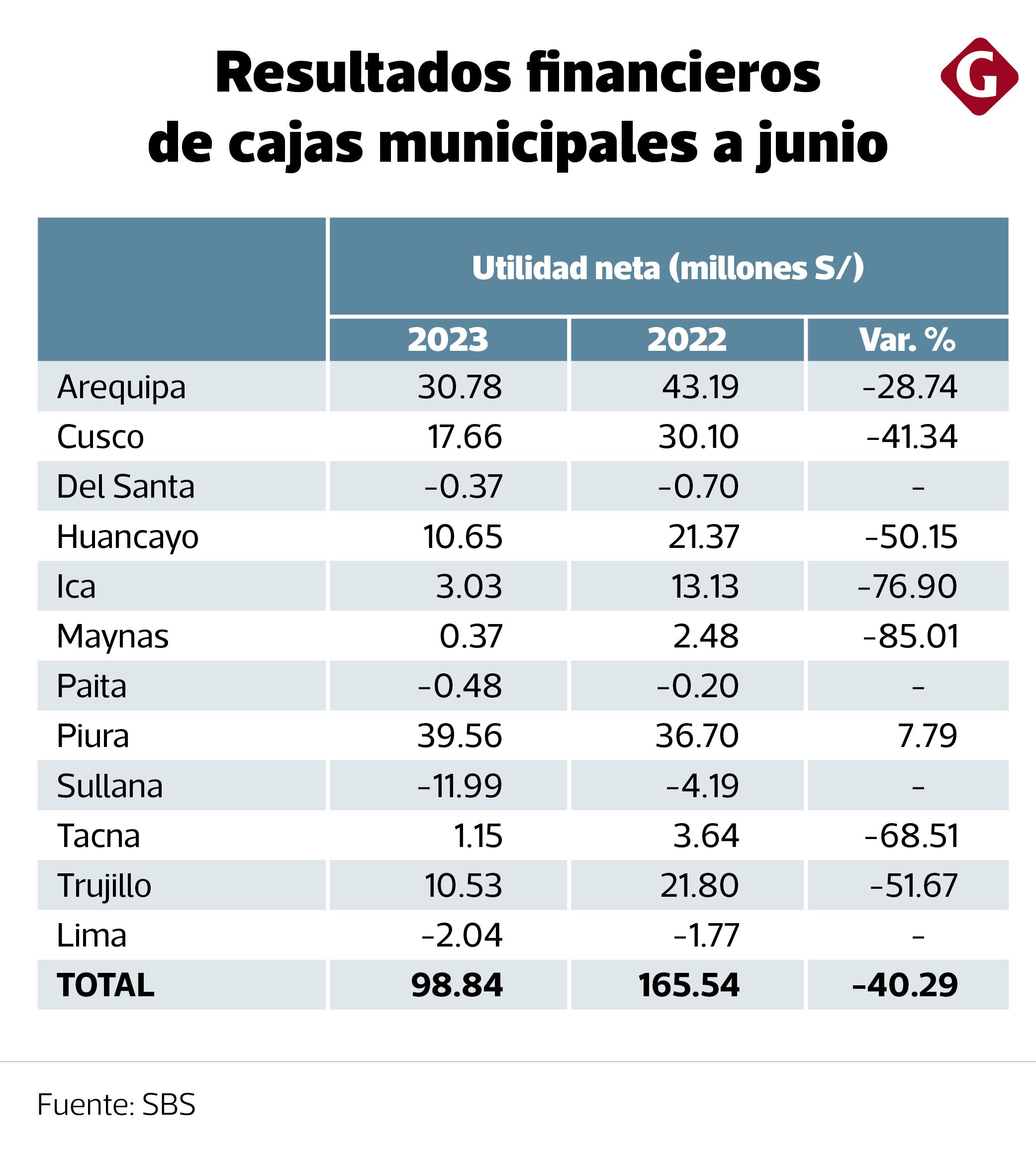 La utilidad neta de las cajas municipales en conjunto sumó S/ 98.8 millones al cierre del primer semestre, cifra que representa una caída de 40.29% comparada con similar periodo de 2022 (S/ 165.5 millones), según datos de la Superintendencia de Banca, Seguros y AFP (SBS).