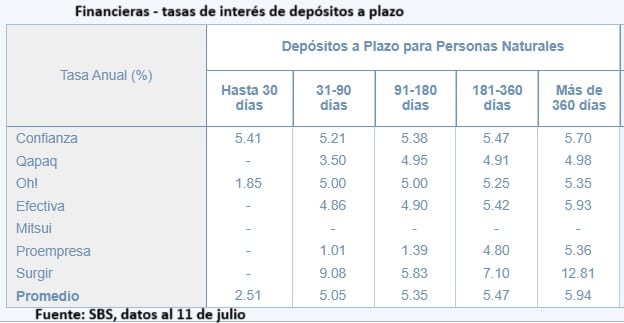 En el caso de las financieras, la mayor tasa para un depósito a 360 días la paga Surgir (7.1%), según el reporte de la SBS, también con datos al 11 de julio (ver cuadro).