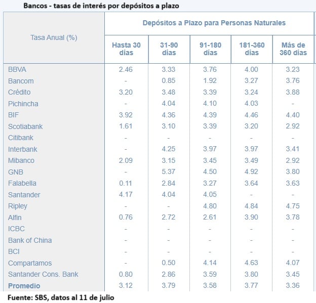 En el caso de los bancos, para los depósitos a plazo de un año (360 días), la mayor tasa la paga el banco GNB (4.9%), según muestra el reporte de la SBS con datos al 11 de julio (ver cuadro).