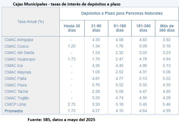 El reporte de las Cajas Municipales y Cajas Rurales es de una fecha anterior, al mes de mayo. La Caja Municipal de Lima es la que paga una mayor tasa (5.4%), mientras que en las Cajas Rurales la mayor tasa es de Incasur (6.5%).