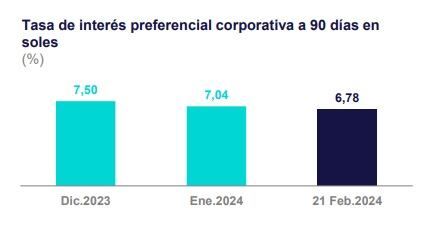 Así, al 21 de febrero, la tasa de interés preferencial corporativa a 90 días en soles, la que se cobra a las empresas de menor riesgo, disminuyó de 7.04% en enero último a 6.78% anual en febrero, indicó el BCRP.