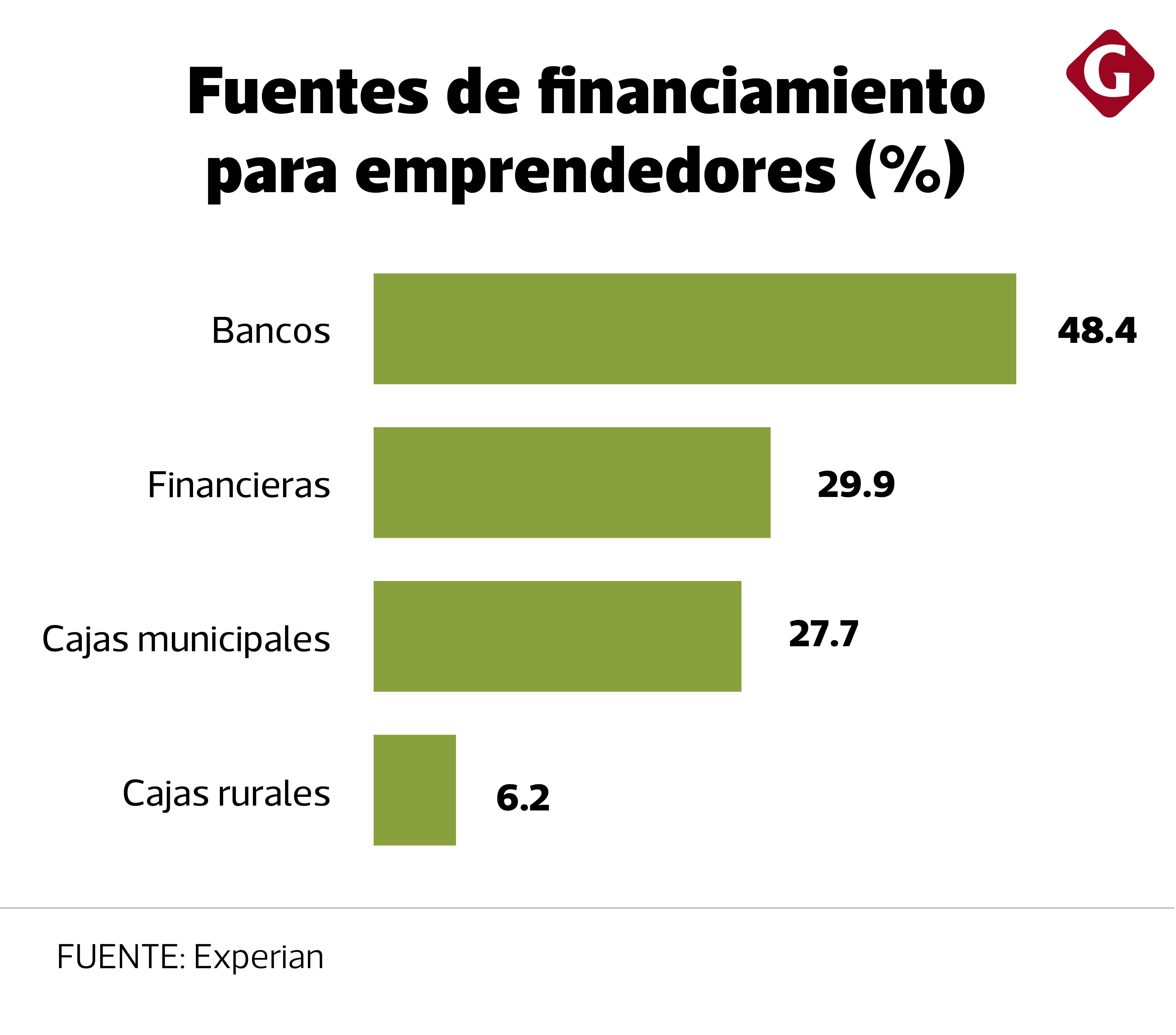 Por fuente de financiamiento, el estudio arrojó que el 48.4% de los emprendedores acuden a la banca en busca de fondos, un 29.9% a financieras, 27.7% a cajas municipales y 6.2% a cajas rurales.