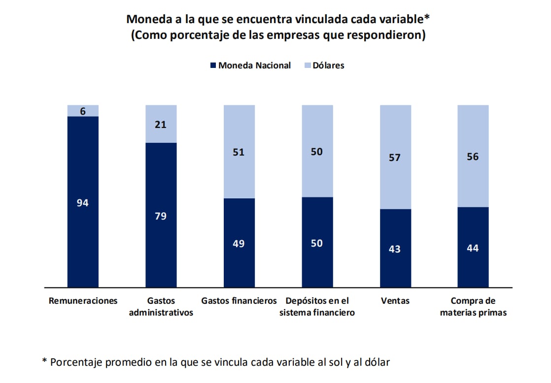 Según la encuesta del Banco Central, el 56% de empresas consultadas realiza la adquisición de insumos en la moneda estadounidense, mientras que el 51% la usa para gastos financieros. El año previo, dichos porcentajes fueron de 55% y 48%, respectivamente.