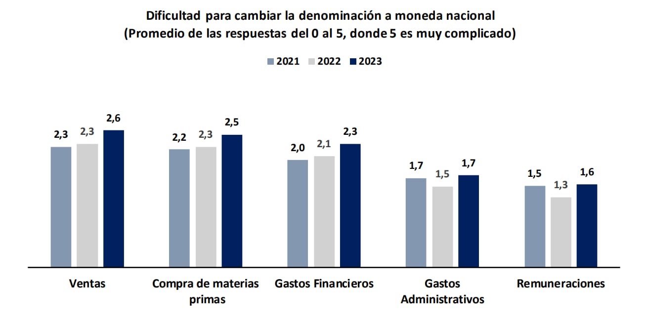 Además, las firmas entrevistadas consideran que las ventas, compra de materias primas y gastos financieros son las operaciones con mayor dificultad para ser cambiadas de divisa extranjera a moneda nacional. Y las remuneraciones y gastos administrativos son los menos complicados para reemplazar dólares por soles.