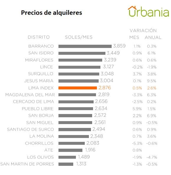 El precio medio de alquiler de un departamento de 100 m2 en Lima se ubica en S/ 2,876 por mes. Los mayores precios de alquileres se registran en los distritos de Barranco y San Isidro (ver cuadro).