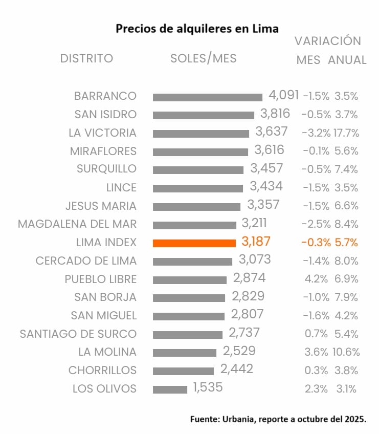 Los precios de los alquileres registraron una evolución positiva el último año en los diversos distritos de la capital. Asimismo, destaca un grupo de seis distritos donde el alza supera el 7% en los últimos doce meses, según muestra un reporte del portal inmobiliario Urbania, con datos a octubre del 2025.