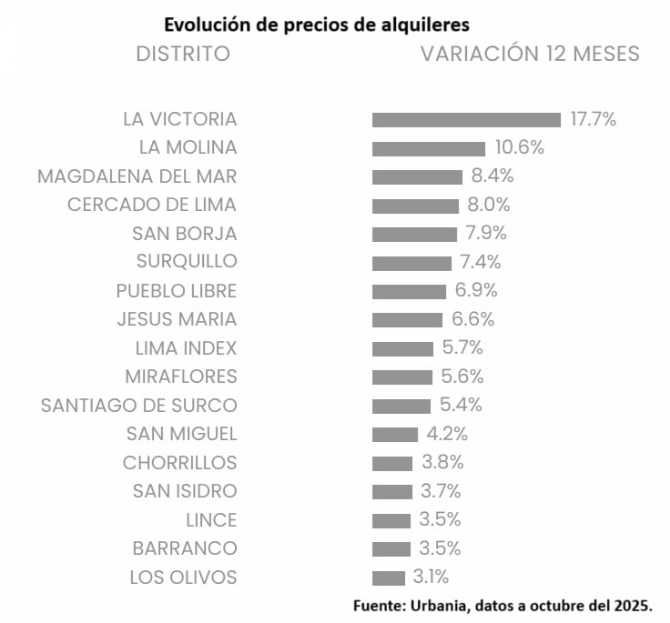 Las mayores alzas de los precios de los alquileres el último año se dieron en los distritos de La Victoria (17.7%), La Molina (10.6%), Magdalena del Mar (8.4%), Cercado de Lima (8%), San Borja (7.9%) y Surquillo (7.4%).