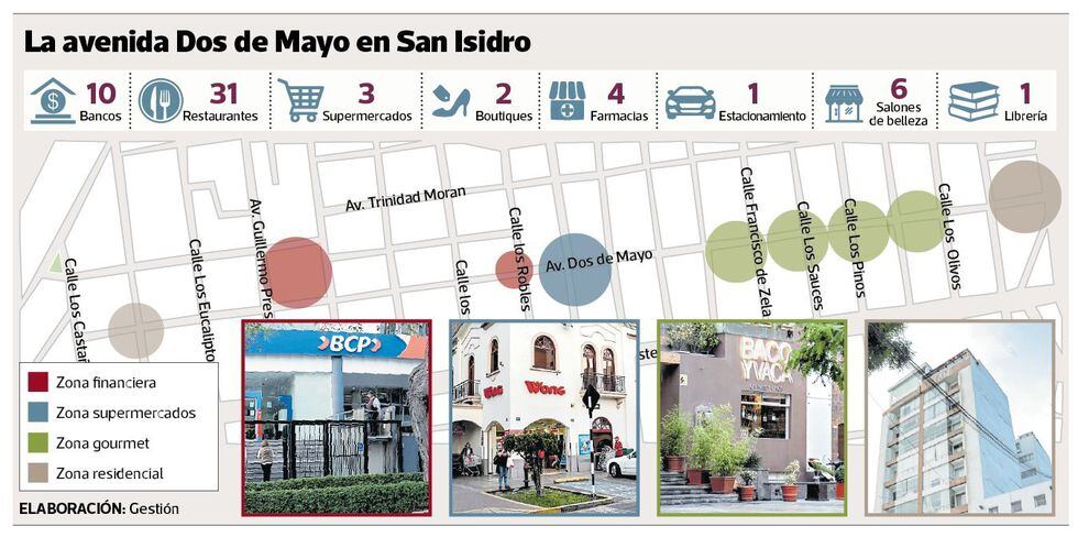 Asimismo, en el cruce con Los Laureles, se encuentran una suerte de ‘hub’ con los locales de las principales entidades financieras del país.