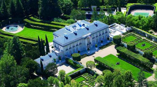 La residencia principal dentro de la propiedad de US$ 350 millones solamente ha cambiado de manos dos veces antes de esto. El arquitecto Sumner Spaulding construyó la colosal mega mansión en un estilo neoclásico de un castillo francés en 1933. Fue vendida en la década de 1940 al hotelero Arnold Kirkeby, cuya familia rentó la casa para el set de la serie de televisión "The Beverly Hillbillies" y luego la vendió a Perenchio por $13.5 millones (11.5 millones de euros) en 1986, según los registros.