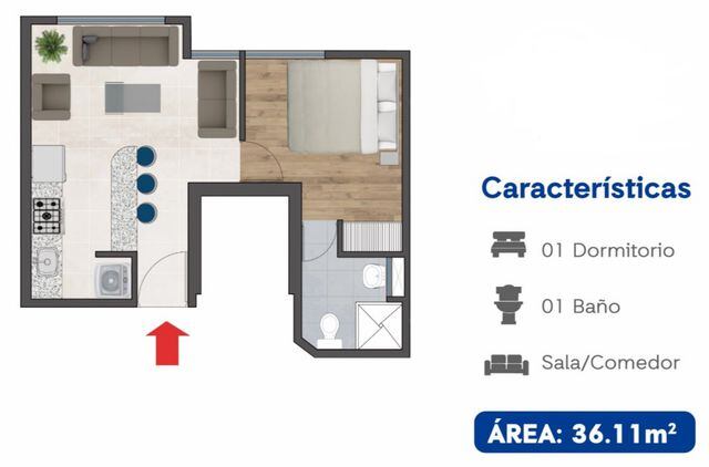 Por ejemplo, la inmobiliaria Real Edificaciones oferta departamentos desde 36 m2 en su proyecto Real 135 Residencial, ubicado en Surquillo. Estos minidepartamentos suelen contar con un solo dormitorio, sala comedor y cocina kitchenette (ver maqueta).