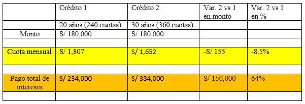 Si el crédito de S/ 180,000 se fija a pagarse en 20 años (240 cuotas mensuales), ello genera que la cuota de pago mensual sea de S/ 1,807. Y en total se terminaría pagando alrededor de S/ 234,000 solo en intereses.