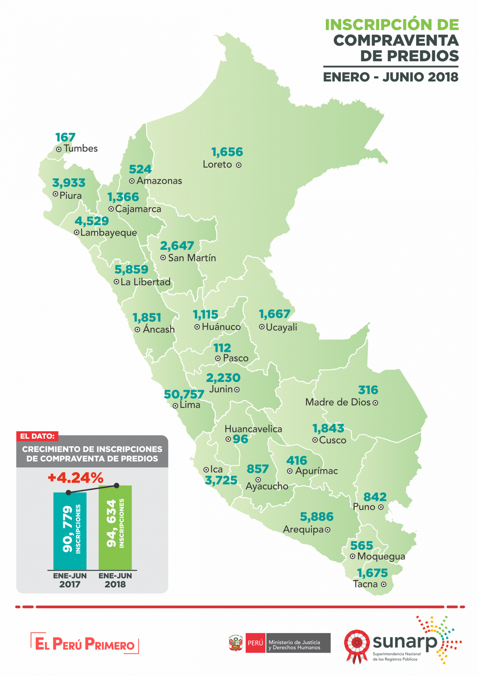 En lo que respecta al periodo de enero a junio se inscribieron en Lima 50,757 compraventas de predios. Le siguen Arequipa (5,886), La Libertad (5,859), Lambayeque (4,529), Piura (3,933), Ica (3,725), San Martín (2,647), Junín (2,230), Áncash (1,851), Cusco (1,843), Tacna (1,675) y Ucayali (1,667).