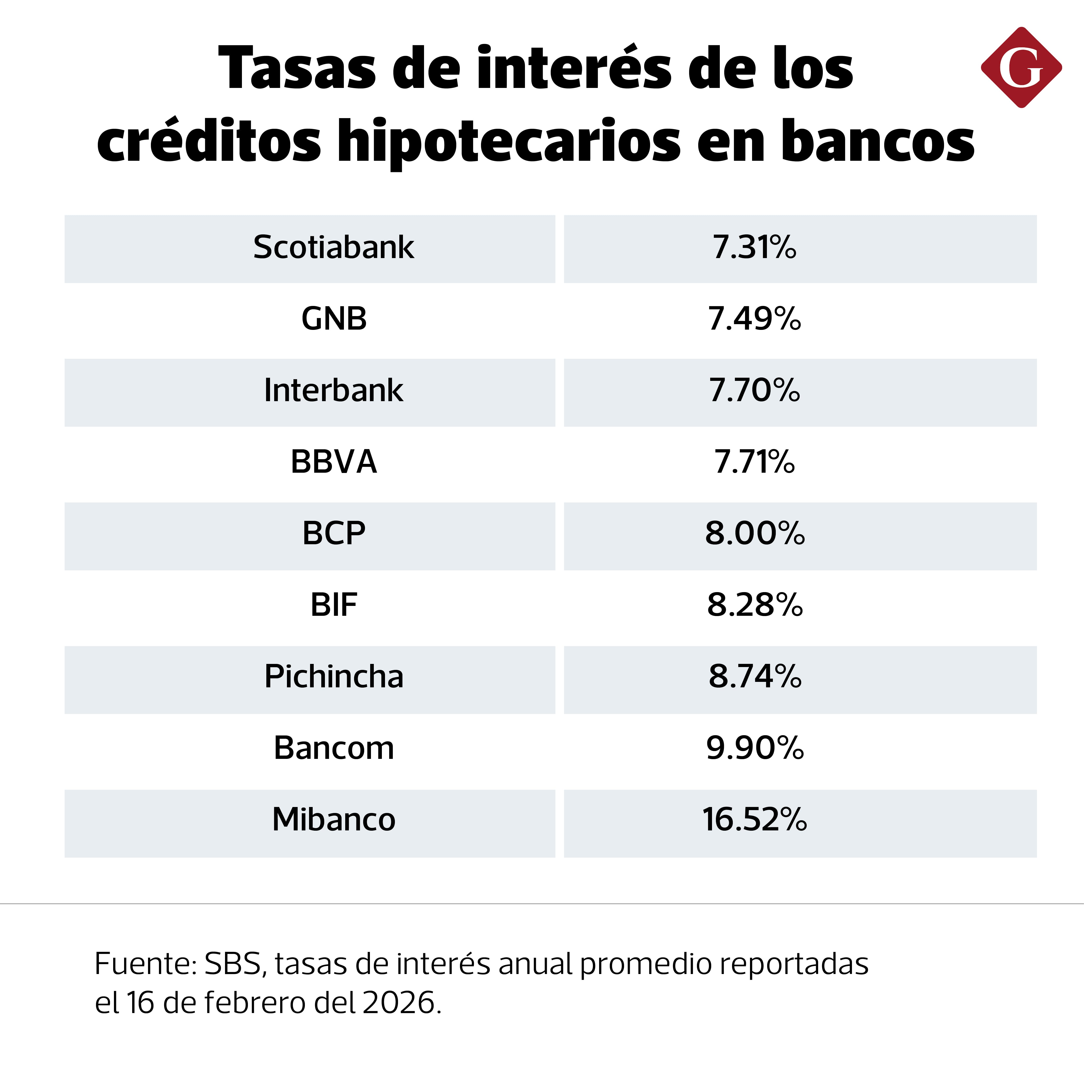 Las tasas de interés de los créditos hipotecarios en el Perú iniciaron el 2026 con una ligera tendencia a la baja. Así lo muestran los datos registrados por los bancos en la Superintendencia de Banca, Seguros y AFP (SBS).
