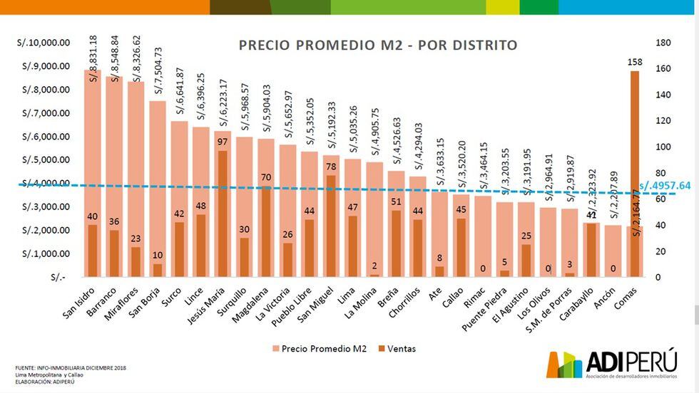 San Isidro, Barranco, Miraflores, San Borja y Surco son los distritos que registran un mayor precio promedio del metro cuadrado, mientras que los distritos de Comás, Ancón, Carabayllo, San Martín de Porres y los Olivos son los registran el menor valor de acuerdo al último informe de la Asociación de Desarrolladores Inmobiliarios (ADI).