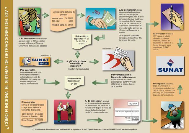 De acuerdo a información de Sunat, el sistema de detracciones funciona para que el adquiriente de un bien o usuario de un servicio, sujeto al sistema tributario, deba restar (detraer) un porcentaje del precio de venta y depositarlo en una cuenta especial, habilitada por el Banco de la Nación y a nombre del proveedor del bien o prestador del servicio.
