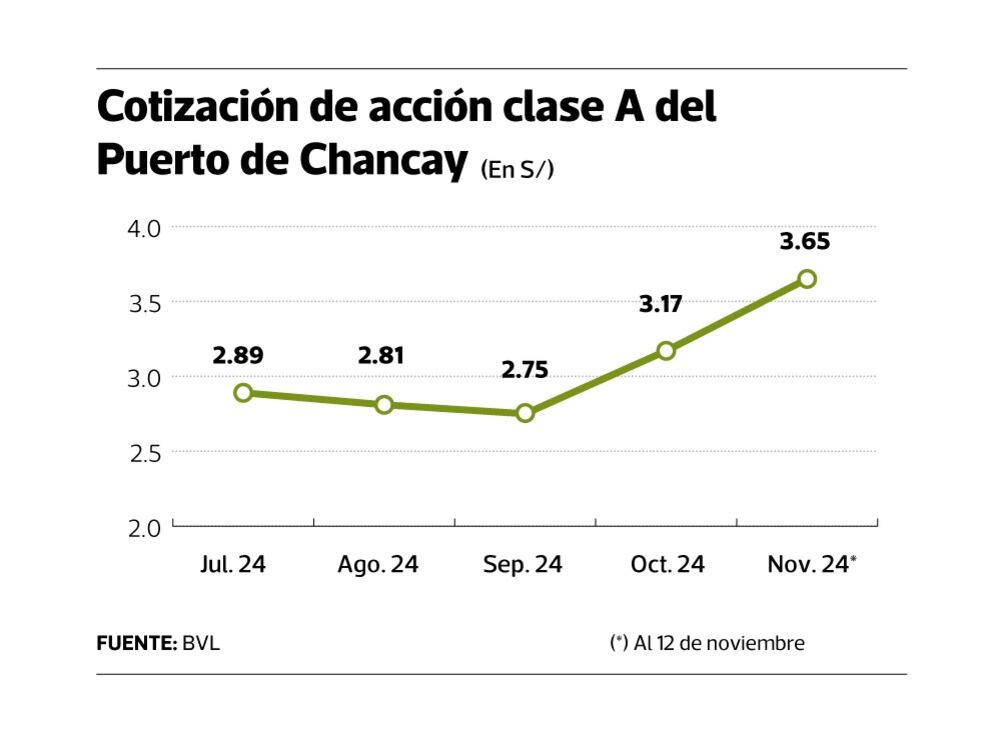 Desde el 11 de octubre, las acciones clase B (sin derecho a voto) de la portuaria subieron 10.82% al cerrar el 12 de noviembre en S/ 0.338. Asimismo, las acciones clase A (que otorgan derecho a voto) reportaron un alza de 29.43% en el mismo periodo y finalizaron el último martes en S/ 3.65.