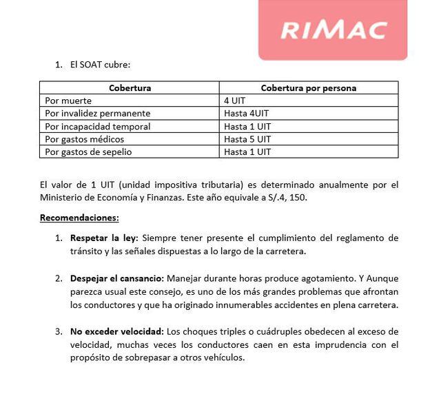 "Actualmente el parque automotor del Perú tiene un aproximado de dos millones y medio de vehículos y se estima que 700 mil vehículos están circulando sin el SOAT vigente. Esto quiere decir que un 30% no está cumpliendo con lo que la ley requiere ya que la ley obliga que todo conductor porte un SOAT vigente", detalla Susana Meza, subgerente de SOAT de Rímac Seguros.