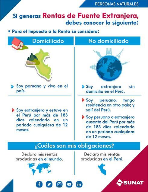 Se considera renta de fuente extranjera aquella obtenida por ciudadanos peruanos o extranjeros domiciliados en el Perú; por ejemplo, por alquilar un inmueble ubicado en el extranjero. También los intereses obtenidos por depósitos bancarios en entidades financieras del exterior, y la renta obtenida por el trabajo personal llevado a cabo fuera del país.