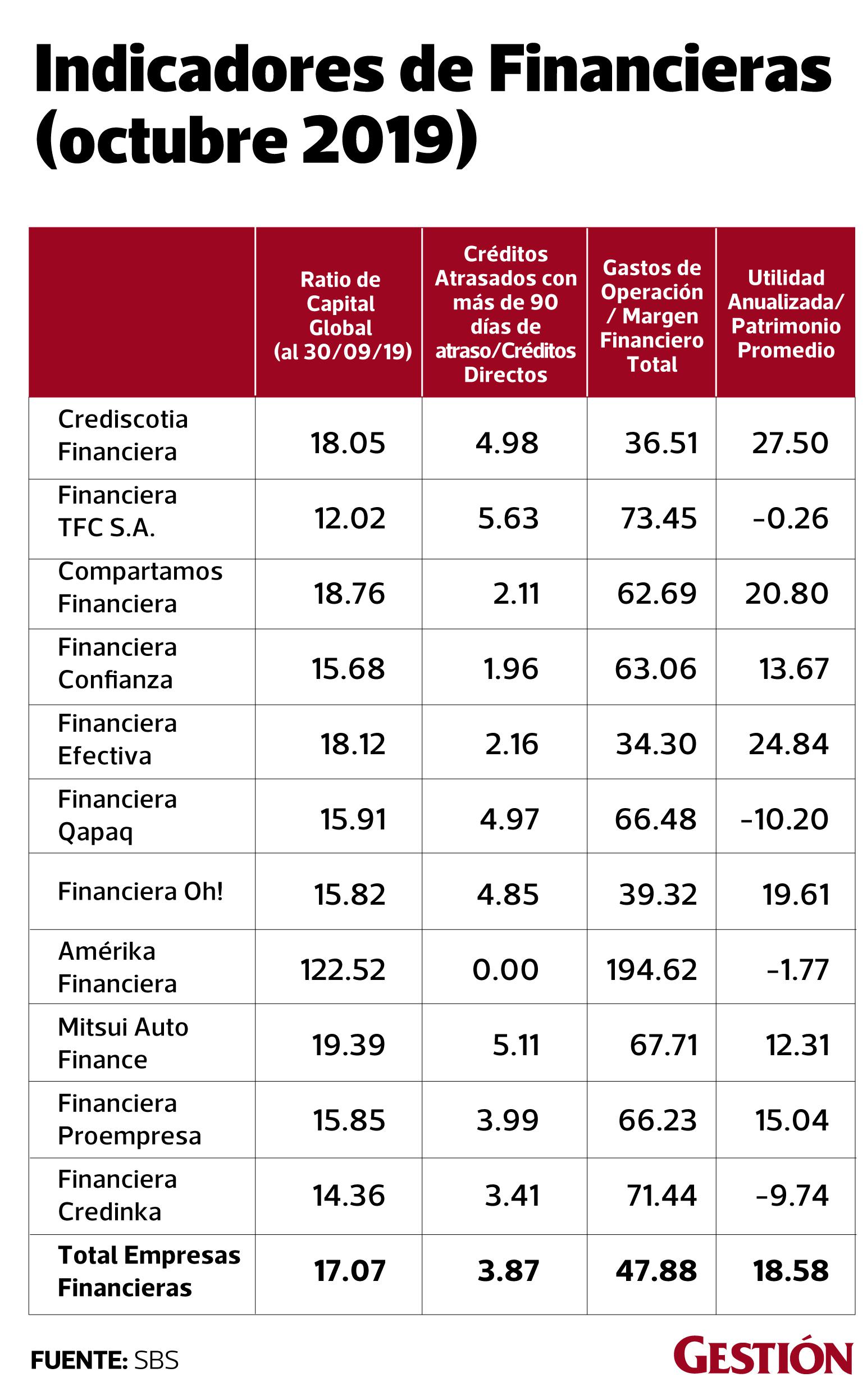 Los indicadores de otras financieras, en algunos casos, muestran niveles similares a los que tenía Financiera TFC hasta el cierre de octubre, lo que podría despertar preocupación sobre si esta medida de la SBS se podría replicar.